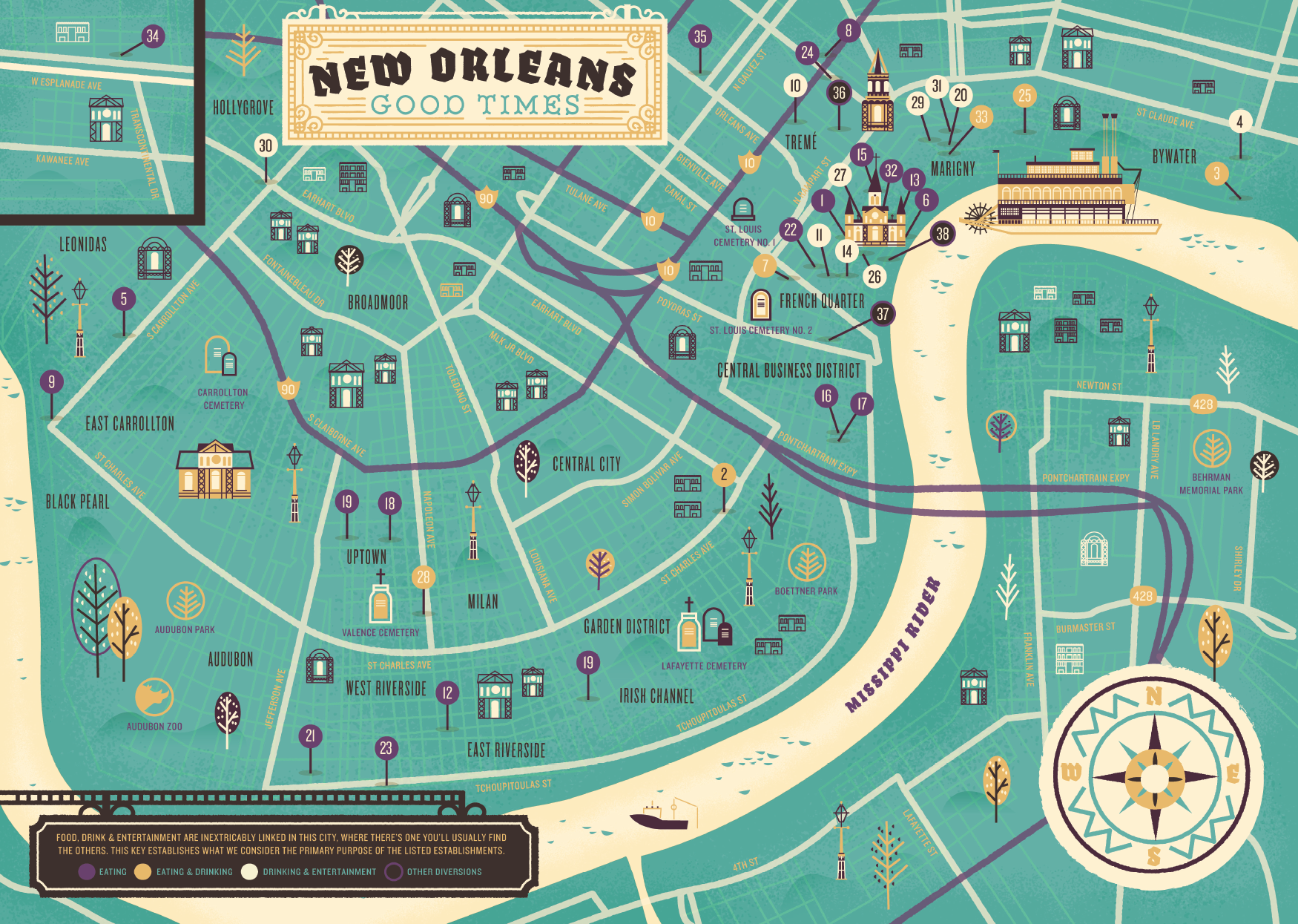 I was approached by Herb Lester to create a map of New Orleans that featured some of the greatest locations for dining, drinking and night life.