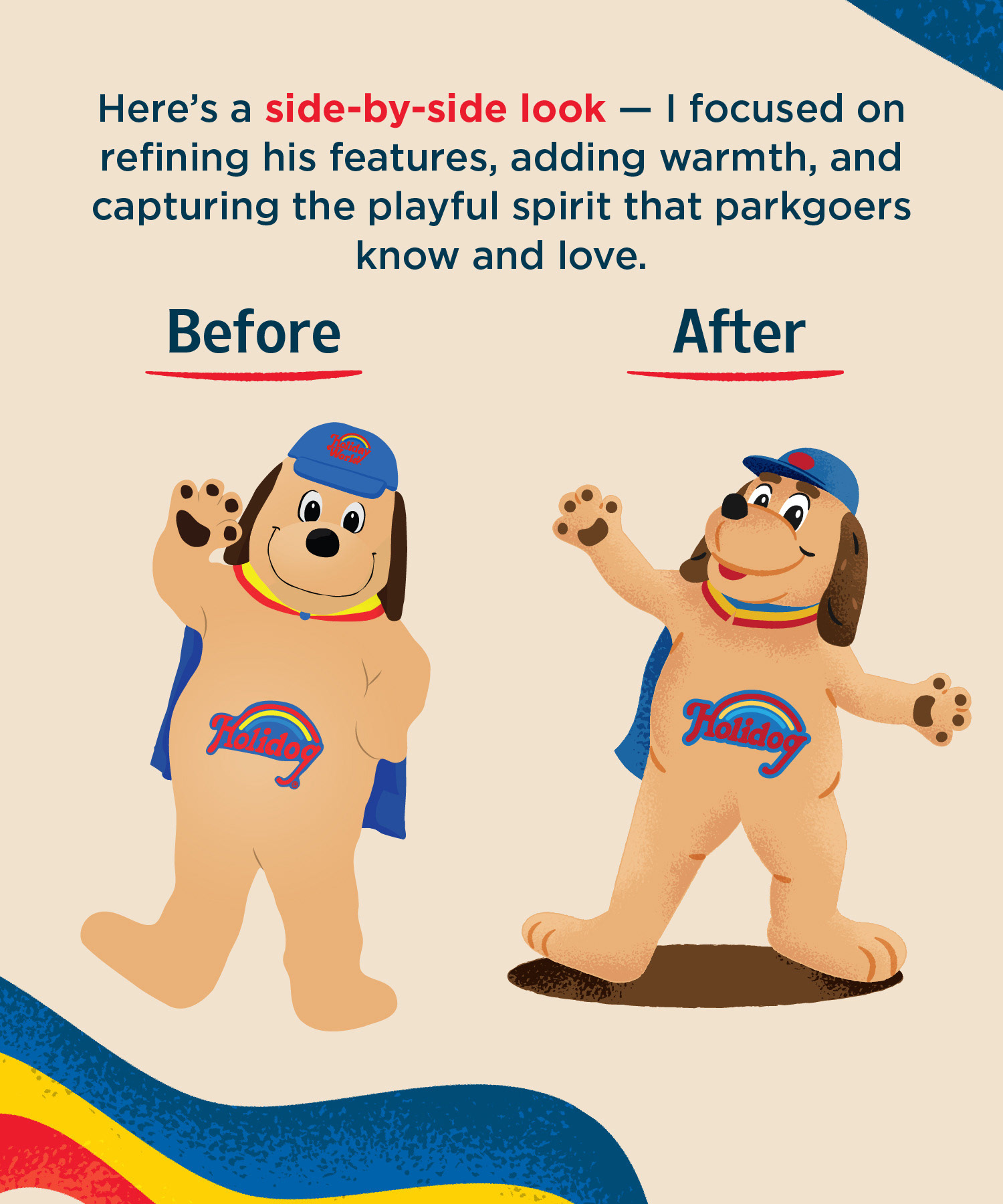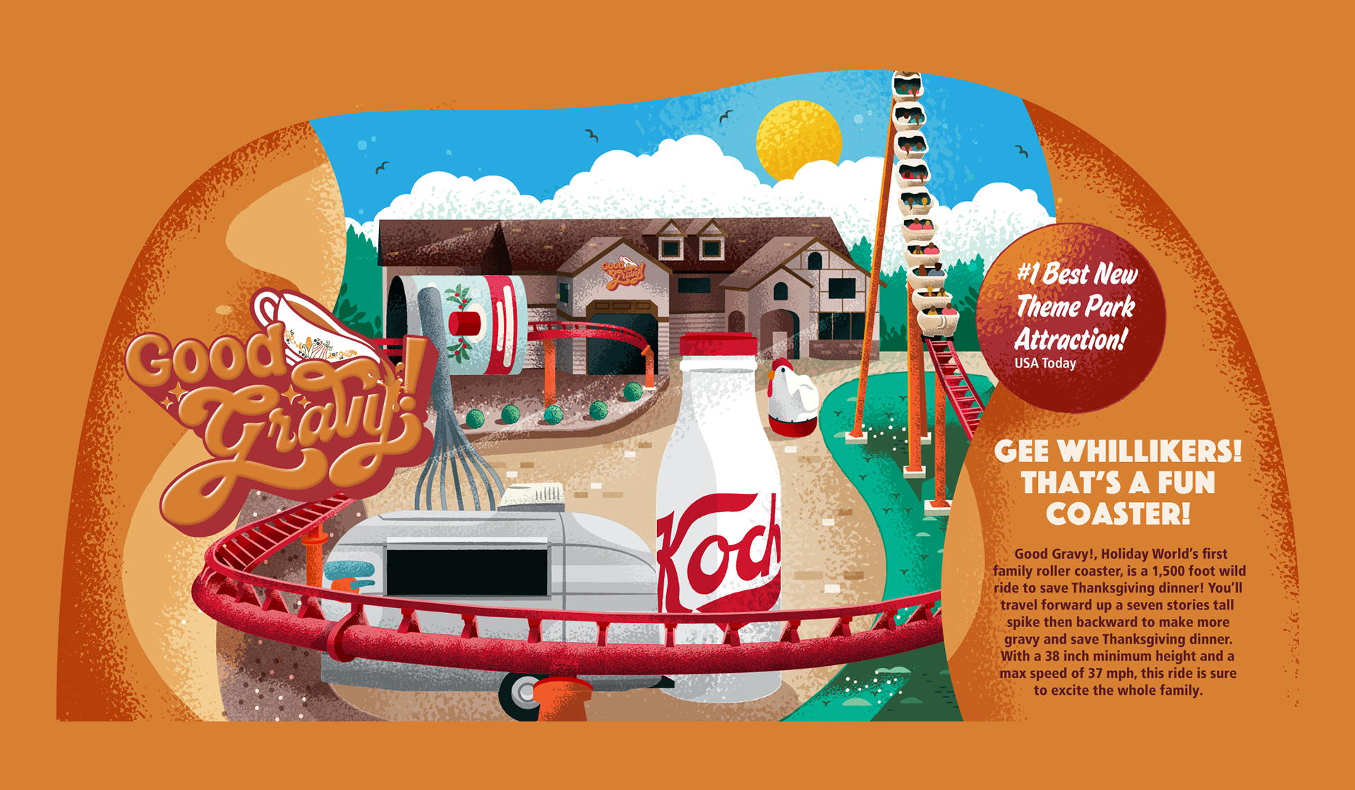 In collaboration with Tanner West Agency I partnered with Tanner West Agency to bring a fresh wave of character and charm to Holiday World’s seasonal brochure. My role centered on illustration, creating artwork that helped define the tone, personality, and visual storytelling of the piece. For this project, I illustrated: The Good Gravy! Family Coaster — a playful, stylized rendering that captures the fun, energy, and welcoming spirit of the ride. A Simplified, Storybook-Style Park Map — crafted to be both functional and whimsical, giving guests an inviting overview of the park with clear shapes, bold colors, and approachable character. Holiday World’s Mascot, Holidog — reimagined in my signature style, blending classic amusement-park charm with warm, modern illustration. Working alongside the Tanner West team, we shaped a brochure that feels joyful, family-friendly, and visually cohesive—an authentic reflection of what makes Holiday World such a beloved destination. My goal was to help the brochure feel not just informative, but memorable: a piece guests want to keep, not toss.